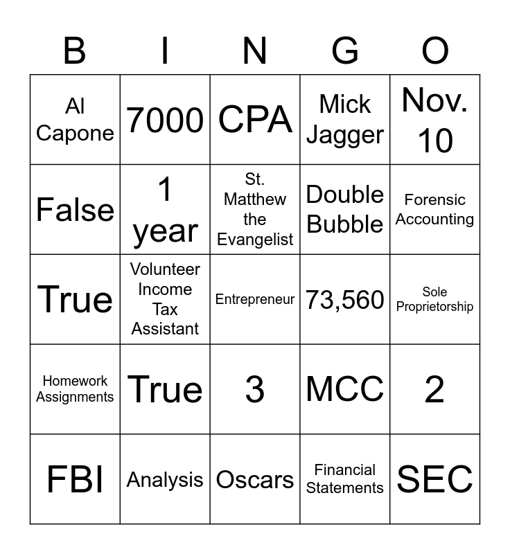 This bingo card has 25 words: True, Oscars, St. Matthew the Evangelist, FBI, Nov. 10, Al Capone, False, 7000, 73,560, 3, Double Bubble, True, MCC, 2, 1 year, SEC, Sole Proprietorship, CPA, Forensic Accounting, Volunteer Income Tax Assistant, Entrepreneur, Analysis, Homework Assignments, Mick Jagger and Financial Statements.