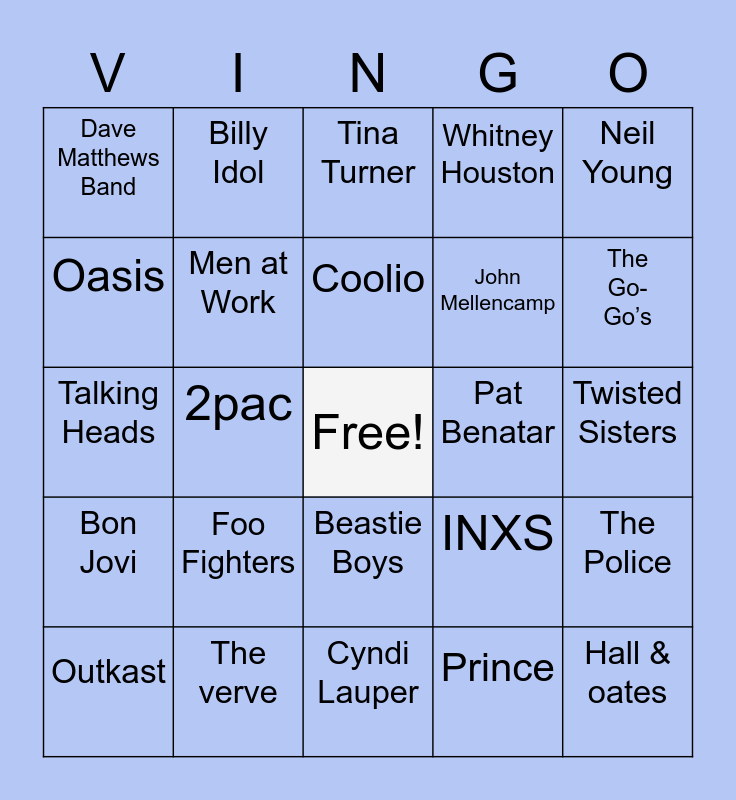 This bingo card has a free space and 24 words: Foo Fighters, The verve, Coolio, Outkast, Neil Young, Dave Matthews Band, Oasis, Billy Idol, Pat Benatar, Beastie Boys, John Mellencamp, Talking Heads, INXS, The Police, Men at Work, Prince, Twisted Sisters, Tina Turner, The Go-Go’s, 2pac, Hall & oates, Bon Jovi, Whitney Houston and Cyndi Lauper.