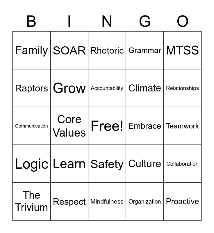 This bingo card has a free space and 26 words: Safety, Organization, Accountability, Respect, MTSS, Family, Raptors, SOAR, Teamwork, Culture, Climate, Communication, Collaboration, The Trivium, Core Values, Classical, Grammar, Logic, Rhetoric, Proactive, Relationships, Mindfulness, Embrace, Learn, Grow and LLCA.