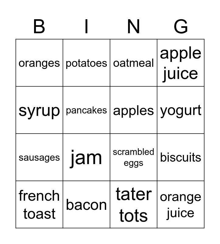 This bingo card has 21 words: bacon, cereal, potatoes, toast, tater tots, apples, oranges, oatmeal, scrambled eggs, yogurt, sausages, apple juice, orange juice, cranberry juice, pancakes, waffles, french toast, jam, syrup, biscuits and milk.