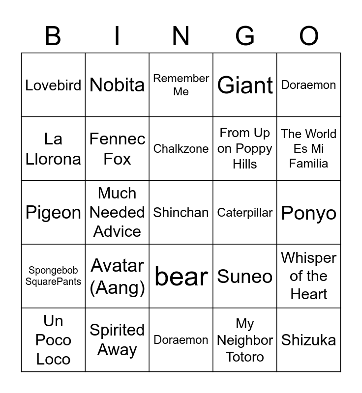 This bingo card has a free space and 24 words: Avatar (Aang), Spirited Away, Chalkzone, Un Poco Loco, Doraemon, Lovebird, La Llorona, Nobita, Caterpillar, bear, From Up on Poppy Hills, Pigeon, Suneo, Whisper of the Heart, Fennec Fox, My Neighbor Totoro, Ponyo, Remember Me, The World Es Mi Familia, Much Needed Advice, Shizuka, Spongebob SquarePants, Giant and Doraemon.