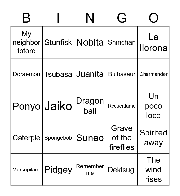 This bingo card has a free space and 24 words: Spongebob, Pidgey, Juanita, Marsupilami, La Ilorona, My neighbor totoro, Doraemon, Stunfisk, Recuerdame, Suneo, Bulbasaur, Ponyo, Grave of the fireflies, Spirited away, Tsubasa, Dekisugi, Un poco loco, Nobita, Charmander, Jaiko, The wind rises, Caterpie, Shinchan and Remember me.