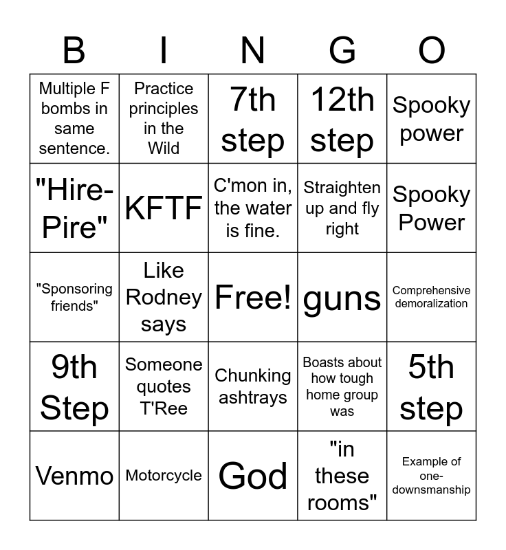 This bingo card has a free space and 68 words: WOW!, Example of one-downsmanship, 4th Step, It's not that AA works - it works every time., Example of how tough a sponsor is, Powerless, Practice principles in the Wild, Pregnant with sponsor's baby, C'mon in, the water is fine., Honesty, Open-mindedness, and Willingness, Chunking ashtrays, Delicate little flower, Comprehensive demoralization, Spooky power, Precisely how we recovered, "Hire-Pire", Like Rodney says, Multiple F bombs in same sentence., Someone quotes Brad, Someone quotes T'Ree, Straighten up and fly right, Boasts about how tough home group was, 9th Step, Every drop of every drink, 10th step, 1st step, 2nd step, 3rd step, 5th step, 6th step, 7th step, 8th step, 10th step, 11th step, 12th step, Promises, 7th tradition, Venmo, Spooky Power, "Sponsoring friends", Sobriety date, Western Trails, KFTF, Zoom, 1st meeting, Powerless, Unmanageable, Desire to quit drinking, guns, Motorcycle, 90 in 90, back corner, Half-measures room, God, as you understand God, Keep coming back, "in these rooms", Home group, Big Blue Book, Homeless, Prison, Power greater than myself, Have a great day unless you've got other plans., Desperation, Sponsor, Secrets, Anonymity and Will power.
