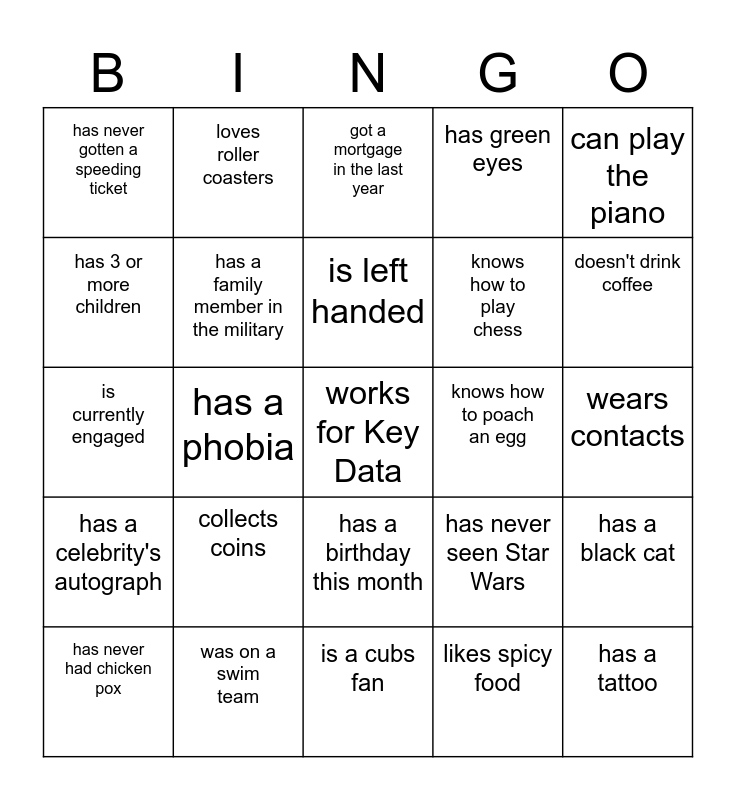 This bingo card has a free space and 24 words: collects coins, was on a swim team, is left handed, has never had chicken pox, can play the piano, has never gotten a speeding ticket, has 3 or more children, loves roller coasters, knows how to poach an egg, has a birthday this month, knows how to play chess, is currently engaged, has never seen Star Wars, has a black cat, has a family member in the military, likes spicy food, wears contacts, got a mortgage in the last year, doesn't drink coffee, has a phobia, has a tattoo, has a celebrity's autograph, has green eyes and is a cubs fan.