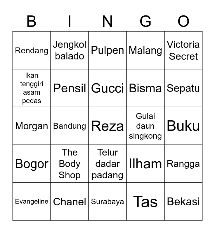 This bingo card has a free space and 24 words: The Body Shop, Chanel, Gucci, Evangeline, Victoria Secret, Rendang, Ikan tenggiri asam pedas, Jengkol balado, Gulai daun singkong, Telur dadar padang, Bisma, Morgan, Ilham, Rangga, Pensil, Tas, Buku, Pulpen, Sepatu, Bandung, Bekasi, Bogor, Malang and Surabaya.