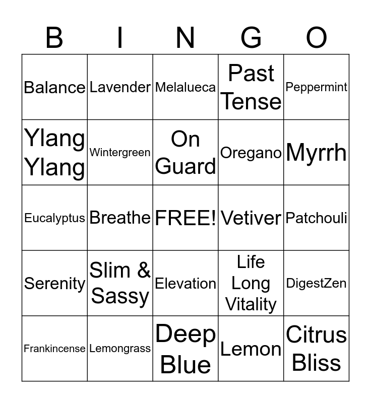 This bingo card has a free space and 24 words: Slim & Sassy, Lemongrass, On Guard, Frankincense, Peppermint, Balance, Ylang Ylang, Lavender, Vetiver, Elevation, Oregano, Eucalyptus, Life Long Vitality, DigestZen, Wintergreen, Lemon, Patchouli, Melalueca, Myrrh, Breathe, Citrus Bliss, Serenity, Past Tense and Deep Blue.