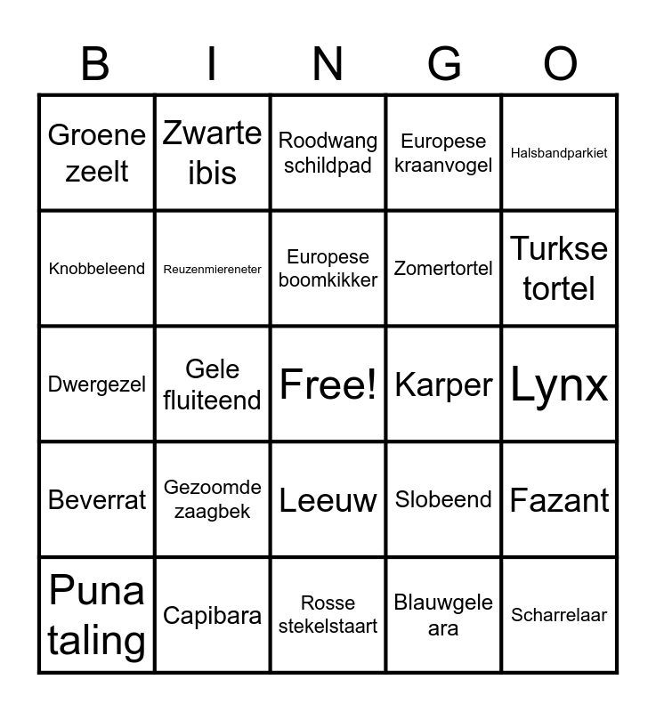 This bingo card has a free space and 125 words: Afrikaanse wilde hond, Berberaap, Aardbei gifkikker, Azara Agouti, Bergbongo, Bergeend, Beverrat, Blauwe ekster, Blauwgele ara, Blauwkeel guan, Boliviaanse doodshoofdaap, Boshond, Bosrendier, Braziliaanse Tapir, Braziliaanse zalmroze vogelspin, Brilibis, Capibara, Carolina eend, Chaco chachalaca, Darwin nandoe, Driedoornige stekelbaars, Dwergezel, Dergnijlpaard, Eikelmuis, Endler guppy, Europese boomkikker, Europese kraanvogel, Europese nerts, Europese otter, Europese rivierkreeft, Fazant, Geelborst capucijnaap, Gele fluiteend, Gezoomde zaagbek, Gouden leeuwaap, Griekse landschildpad, Griel, Grijsvleugel trompetvogel, Grijze wolf, Groene anaconda, Groene zeelt, Groen-zwarte pijlgifkikker, Grootoorvos, Grote Alexander parkiet, Grote flamingo, Grote kudu, Hadada Ibis, Halsbandparkiet, Hamerkop, Hartmann bergzebra, Heilige ibis, Helmparelhoen, Hollandse landgeit, Honingbij, Hop, Huismuis, Juffer kraanvogel, Kaalkopibis, Kameel, Karper, Knobbeleend, Koereiger, Korenwolf, Kuifeend, Kuifmangabey, Kuiseriema, Lakenvelder koe, Leeuw, Livar varken, Lynx, Maanvis, Mandarijneend, Mergelland hoen, Monniksparkiet, Muntjak, Neon tetra, Ooievaar, Oudhollandse meeuw, Penseelzwijn, Picazuroduif, Pos, Prezwalskipaard, Puna Ibis, Puna taling, Reuzenmiereneter, Rietvoorn, Rode brulaap, Rode Ibis, Rode panda, roodbekwever, Roodbunk tamarin, Roodgezicht slingeraap, Roodhalsgans, Roodschoudertaling, Roodwang schildpad, Rosse stekelstaart, Rotschild giraffe, Roze lepelaar, Russische steur, Scharrelaar, Shetlandpony, Slobeend, Springbok, Stekelvarken, Stinkdier, Stokstaart, Struisvogel, Turkse tortel, Veelvraat, Verschrikkelijke pijlgifkikker, Vicuña, Vlaamse reus, Vuursalamander, Wasbeer, Westelijke laaglandgorilla, Witgezicht Oeistitie, Witgezicht saki, Witlip peccari, Witte neushoorn, Zomertortel, Zonneral, Zonparkiet, Zwaangans, Zwarte ibis and Zwartkopwever.