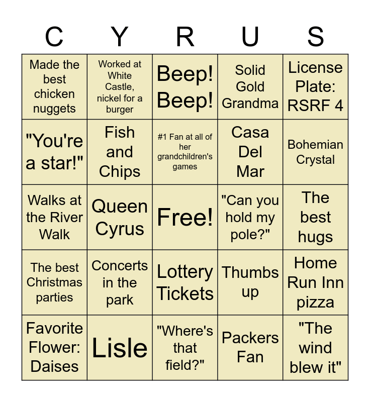 This bingo card has a free space and 24 words: Favorite Flower: Daises, Concerts in the park, #1 Fan at all of her grandchildren's games, Packers Fan, License Plate: RSRF 4, Made the best chicken nuggets, Worked at White Castle, nickel for a burger, Beep! Beep!, "Can you hold my pole?", The best hugs, Walks at the River Walk, Fish and Chips, Thumbs up, Home Run Inn pizza, "You're a star!", Lisle, "Where's that field?", Solid Gold Grandma, Bohemian Crystal, The best Christmas parties, Queen Cyrus, Lottery Tickets, Casa Del Mar and "The wind blew it".