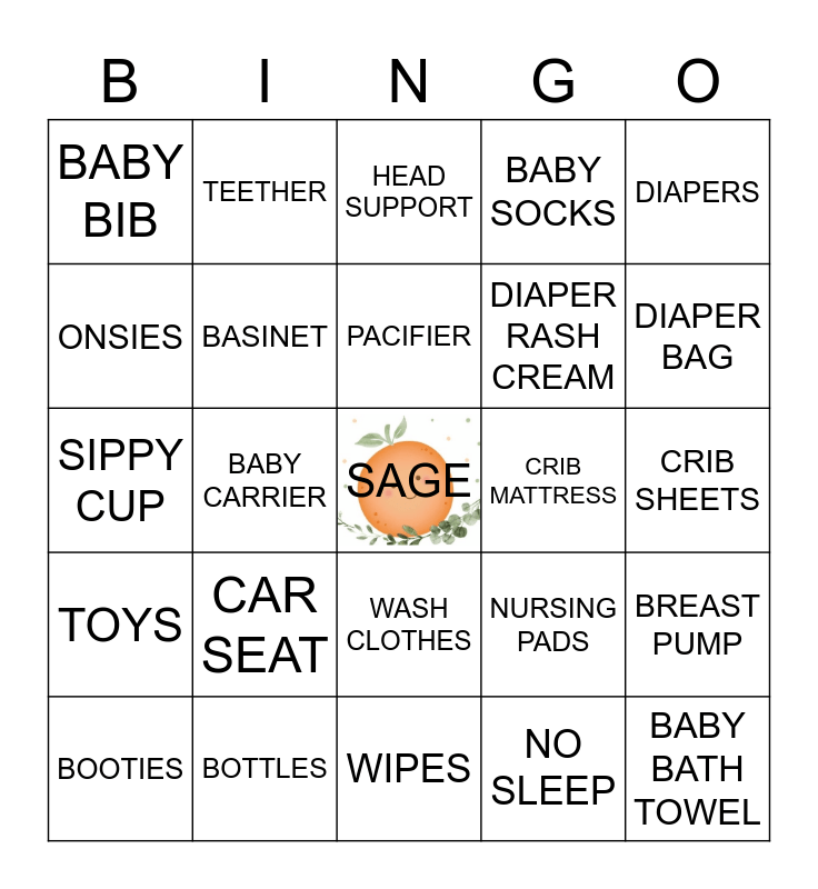This bingo card has a free space and 24 words: CAR SEAT, BOTTLES, PACIFIER, BOOTIES, DIAPERS, BABY BIB, ONSIES, TEETHER, CRIB MATTRESS, WASH CLOTHES, DIAPER RASH CREAM, SIPPY CUP, NURSING PADS, BREAST PUMP, BASINET, NO SLEEP, CRIB SHEETS, HEAD SUPPORT, DIAPER BAG, BABY CARRIER, BABY BATH TOWEL, TOYS, BABY SOCKS and WIPES.