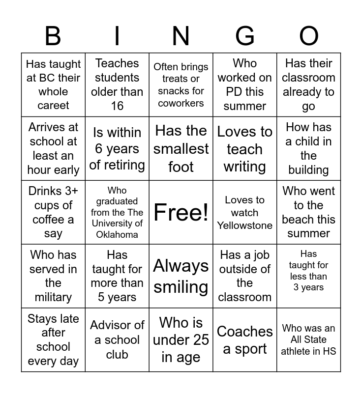 This bingo card has a free space and 24 words: Has taught for more than 5 years, Advisor of a school club, Has the smallest foot, Stays late after school every day, Has their classroom already to go, Has taught at BC their whole careet, Arrives at school at least an hour early, Teaches students older than 16, Loves to watch Yellowstone, Always smiling, Loves to teach writing, Drinks 3+ cups of coffee a say, Has a job outside of the classroom, Has taught for less than 3 years, Is within 6 years of retiring, Coaches a sport, Who went to the beach this summer, Often brings treats or snacks for coworkers, How has a child in the building, Who graduated from the The University of Oklahoma, Who was an All State athlete in HS, Who has served in the military, Who worked on PD this summer and Who is under 25 in age.