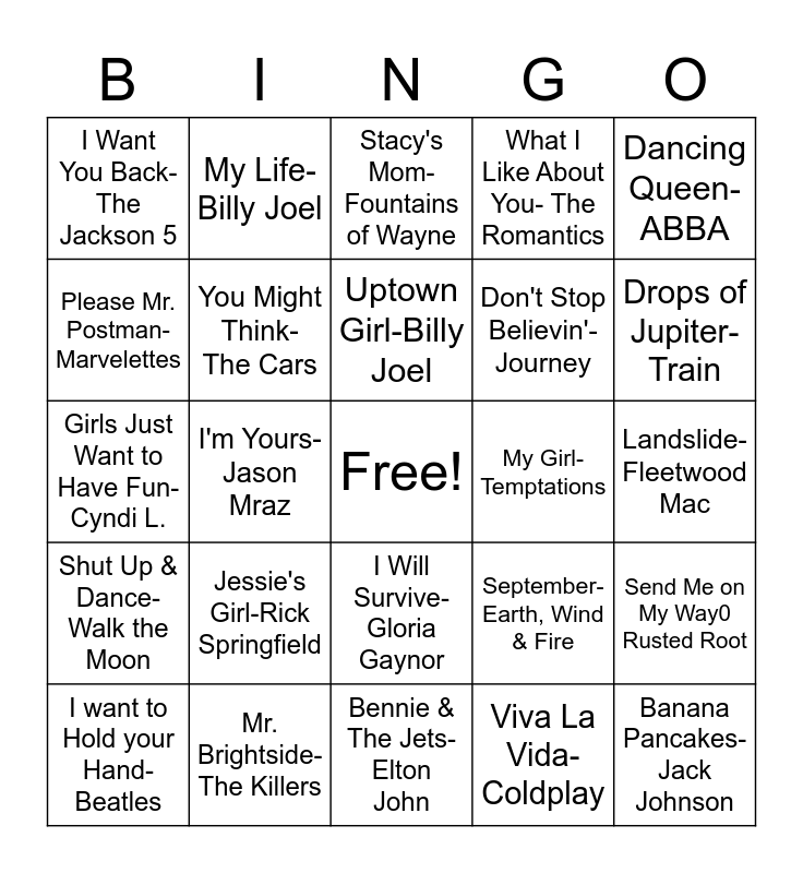 This bingo card has a free space and 24 words: Jessie's Girl-Rick Springfield, Mr. Brightside-The Killers, Uptown Girl-Billy Joel, I want to Hold your Hand-Beatles, Dancing Queen-ABBA, I Want You Back-The Jackson 5, Please Mr. Postman-Marvelettes, My Life- Billy Joel, My Girl- Temptations, I Will Survive- Gloria Gaynor, Don't Stop Believin'- Journey, Girls Just Want to Have Fun- Cyndi L., September- Earth, Wind & Fire, Send Me on My Way0 Rusted Root, You Might Think- The Cars, Viva La Vida- Coldplay, Landslide- Fleetwood Mac, Stacy's Mom- Fountains of Wayne, Drops of Jupiter- Train, I'm Yours- Jason Mraz, Banana Pancakes- Jack Johnson, Shut Up & Dance- Walk the Moon, What I Like About You- The Romantics and Bennie & The Jets- Elton John.