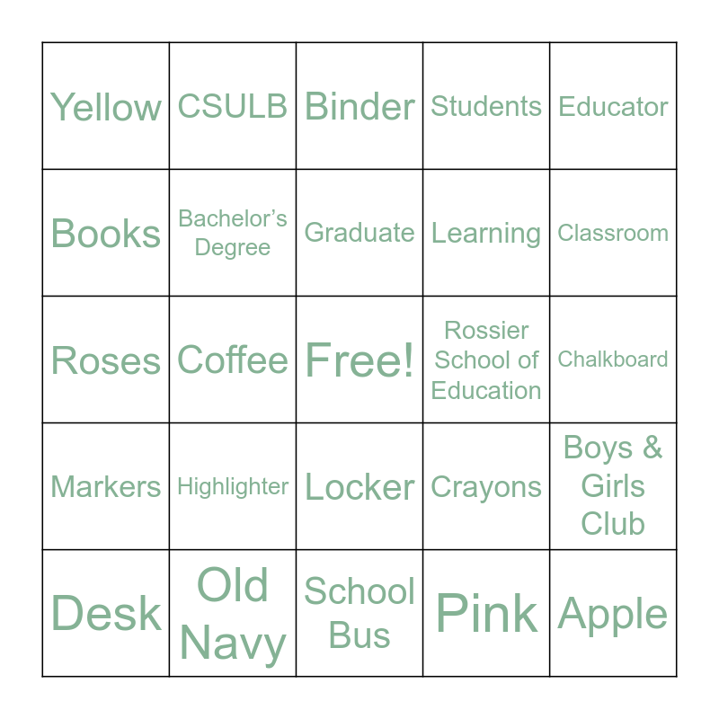 This bingo card has a free space and 48 words: Teacher, Apple, Pencil, School Bus, Highlighter, Class of 2021, CSULB, Education, Books, USC, Bachelor’s Degree, Students, Boys & Girls Club, Crayons, Palestine, Gimzo, Graduate, Rossier School of Education, Arts & Crafts, Educator, Coffee, Pink, Yellow, Learning, Happiness, Classroom, Desk, Notebook, Locker, Markers, Colored Pencils, Ruler, Recess, Globe, Old Navy, Target, Candles, Chalkboard, Backpack, Summers Off, Crayola, Organization, Binder, Sunflower, Roses, Elephant, Family and Disneyland.