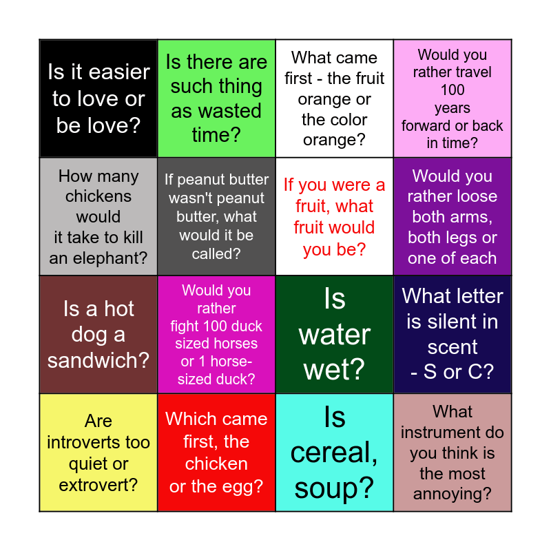 This bingo card has 16 words: Which came first, the chicken or the egg?, What letter is silent in scent - S or C?, What came first - the fruit orange or the color orange?, Is it easier to love or be love?, Is a hot dog a sandwich?, Is there are such thing as wasted time?, Is water wet?, Is cereal, soup?, How many chickens would it take to kill an elephant?, If peanut butter wasn't peanut butter, what would it be called?, Are introverts too quiet or extrovert?, Would you rather travel 100 years forward or back in time?, Would you rather fight 100 duck sized horses or 1 horse-sized duck?, Would you rather loose both arms, both legs or one of each, If you were a fruit, what fruit would you be? and What instrument do you think is the most annoying?.