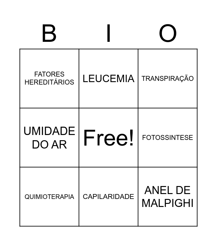 This bingo card has a free space and 30 words: MACRONUTRIENTES, METABOLISMO, CÂNCER, TUMOR, TRANSPIRAÇÃO, FATORES HEREDITÁRIOS, CAPILARIDADE, RAIZES, ÁGUA E NUTRIENTES, APOPTOSE, METÁSTASE, MORTE DA PLANTA, BENIGNO, TAMANHO DESRREGULADO, QUIMIOTERAPIA, AUTOTRÓFICOS, EQUILÍBRIO TÉRMICO, FASE S, ESTÔMATOS, SOLO, DE CIMA PARA BAIXO, XILEMA, FOTOSSINTESE, UMIDADE DO AR, LEUCEMIA, ANEL DE MALPIGHI, FLOEMA, PRESSÃO POSITIVA DA RAIZ, K ( POTÁSSIO) and CLIMA.