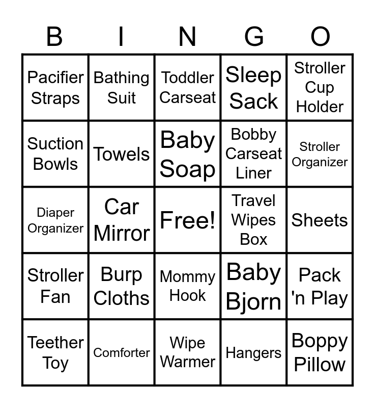 This bingo card has a free space and 69 words: Bassinet, Sheets, Bathtub, Blankets, Comforter, Swaddles, Sleep Sack, Sun-Dome, Stroller Cup Holder, Bouncy Seat, Pack 'n Play, Mini Sterilizer, Pacifier Straps, Toddler Carseat, Stroller Seat Liner, Car Mirror, Mommy Hook, Bobby Carseat Liner, Carseat Cover, Stroller Fan, Travel Wipes Box, Baby Bjorn, Stroller Organizer, Shopping Cart Cover, Carseat Strap Cover, Carseat Arm Cushion, Backseat Organizer, Car Seat Protector, Hangers, Pajamas, Bathing Suit, Dress, Shorts/Shirt, Socks, Hat, Headband, Mittens, Bottle Sterilizer, Suction Bowls, Suction Plate, Burp Cloths, Boppy Pillow, Baby Bottles, Bottle Bag/Cooler, Pacifiers, Teether Toy, Bottle Cleaning Items, Washcloths, Bath Toy, Towels, Baby Soap, Changing Pad, Changing Pad Cover, Wipe Warmer, Diaper Genie, Night Light, Rug, Crib Mattress, Basket, Diaper Organizer, Foam Playmat, Babyproofing Gear, First Aid Supplies, Toy, Book, Owlet Dream Lab, Crib Bumpers, Diapers and Wipes.