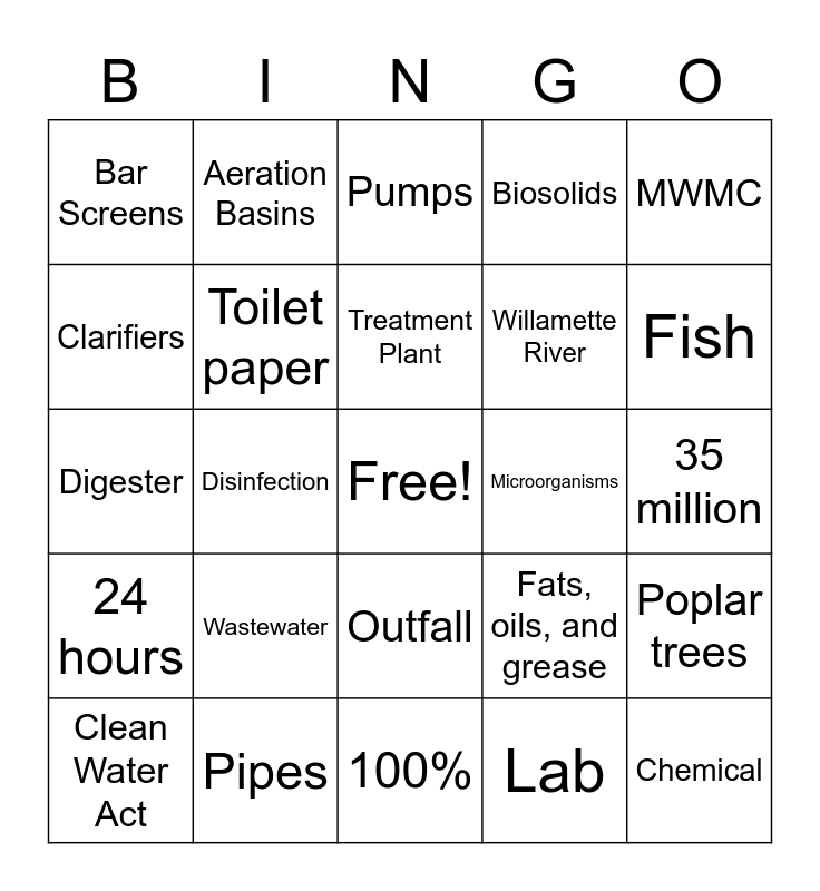 This bingo card has a free space and 24 words: Wastewater, Pipes, Treatment Plant, Clean Water Act, MWMC, Bar Screens, Clarifiers, Aeration Basins, Microorganisms, Outfall, Willamette River, Digester, Fats, oils, and grease, Poplar trees, Toilet paper, Lab, 35 million, Pumps, Fish, Disinfection, Chemical, 24 hours, Biosolids and 100%.