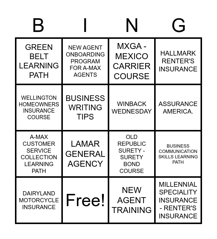This bingo card has 16 words: Free!, BUSINESS COMMUNICATION SKILLS LEARNING PATH, MXGA - MEXICO CARRIER COURSE, GREEN BELT LEARNING PATH, A-MAX CUSTOMER SERVICE COLLECTION LEARNING PATH, NEW AGENT ONBOARDING PROGRAM FOR A-MAX AGENTS, OLD REPUBLIC SURETY - SURETY BOND COURSE, NEW AGENT TRAINING, WELLINGTON HOMEOWNERS INSURANCE COURSE, BUSINESS WRITING TIPS, DAIRYLAND MOTORCYCLE INSURANCE, HALLMARK RENTER'S INSURANCE, LAMAR GENERAL AGENCY, ASSURANCE AMERICA., WINBACK WEDNESDAY and MILLENNIAL SPECIALITY INSURANCE - RENTER'S INSURANCE.