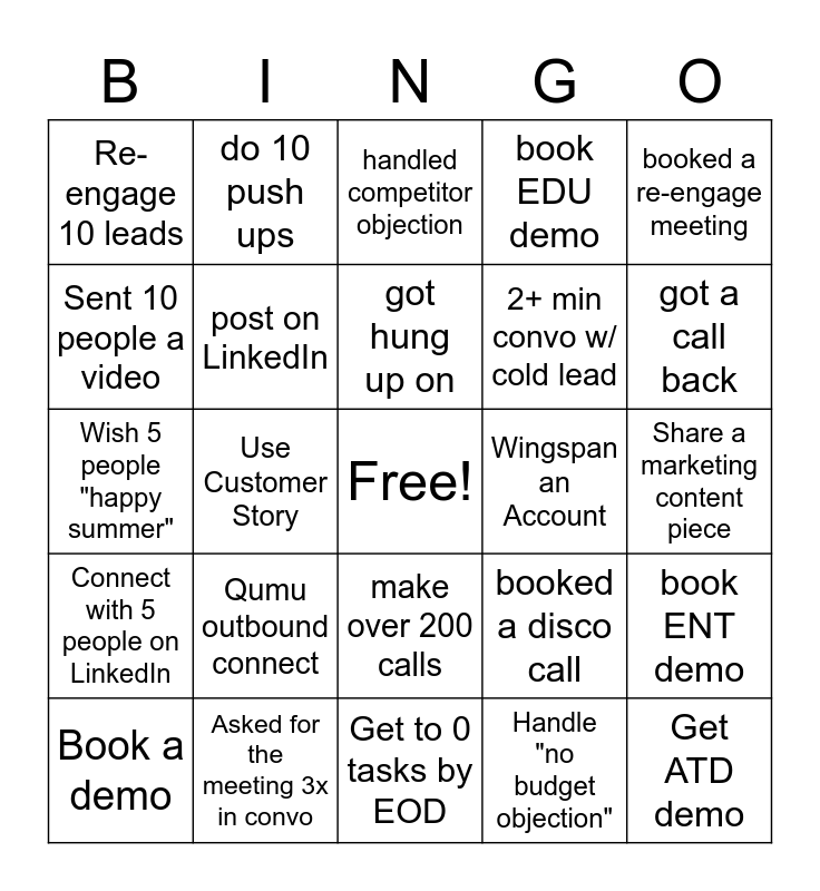 This bingo card has a free space and 29 words: Book a demo, Get a referral, Use Customer Story, Make 125+ calls, Re-engage 10 leads, handled competitor objection, post on LinkedIn, Qumu outbound connect, Wingspan an Account, Asked for the meeting 3x in convo, Share a marketing content piece, Get ATD demo, Get to 0 tasks by EOD, Handle "no budget objection", got a call back, write tailored email, make over 200 calls, Connect with 5 people on LinkedIn, booked a re-engage meeting, Wish 5 people "happy summer", booked a disco call, Handle "we're all set" objection, 2+ min convo w/ cold lead, Sent 10 people a video, book EDU demo, do 10 push ups, book ENT demo, got hung up on and Reference a customer.