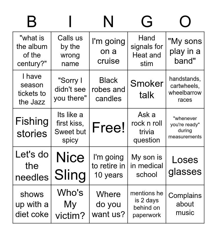 This bingo card has a free space and 24 words: Nice Sling, Who's My victim?, Black robes and candles, shows up with a diet coke, "My sons play in a band", "what is the album of the century?", I have season tickets to the Jazz, Calls us by the wrong name, Ask a rock n roll trivia question, I'm going to retire in 10 years, Smoker talk, Fishing stories, My son is in medical school, Loses glasses, "Sorry I didn't see you there", mentions he is 2 days behind on paperwork, "whenever you're ready" during measurements, I'm going on a cruise, handstands, cartwheels, wheelbarrow races, Its like a first kiss, Sweet but spicy, Complains about music, Let's do the needles, Hand signals for Heat and stim and Where do you want us?.
