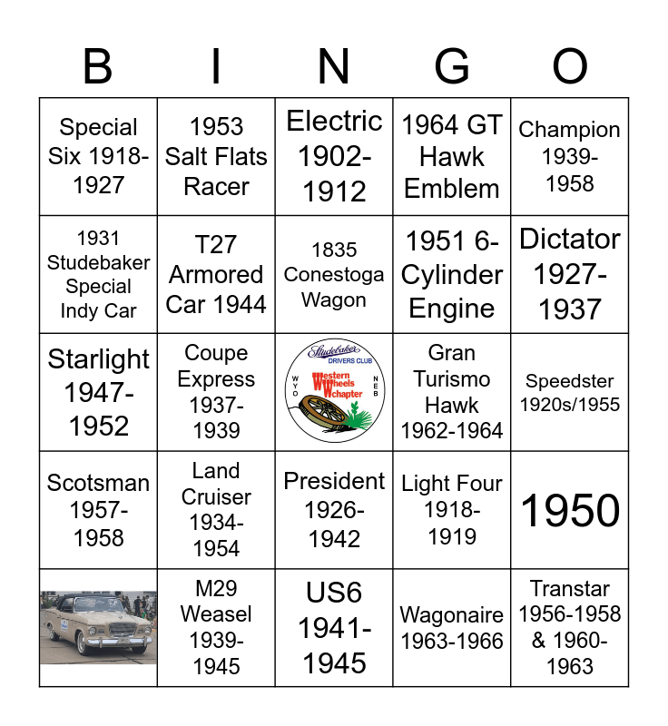 This bingo card has 1 images, a free space and 28 words: Conestoga 1954-1955, Coupe Express 1937-1939, Avanti 1962-1963, Special Six 1918-1927, Electric 1902-1912, T27 Armored Car 1944, Land Cruiser 1934-1954, Gran Turismo Hawk 1962-1964, M29 Weasel 1939-1945, Speedster 1920s/1955, Transtar 1956-1958 & 1960-1963, US6 1941-1945, Wagonaire 1963-1966, Dictator 1927-1937, Golden Hawk 1956-1958, President 1926-1942, Scotsman 1957-1958, Champion 1939-1958, Starlight 1947-1952, Light Four 1918-1919, E Series Truck 1955-1963, 1951 6-Cylinder Engine, 1931 Studebaker Special Indy Car, 1964 GT Hawk Emblem, 1953 Salt Flats Racer, 1950, 1835 Conestoga Wagon and STP.