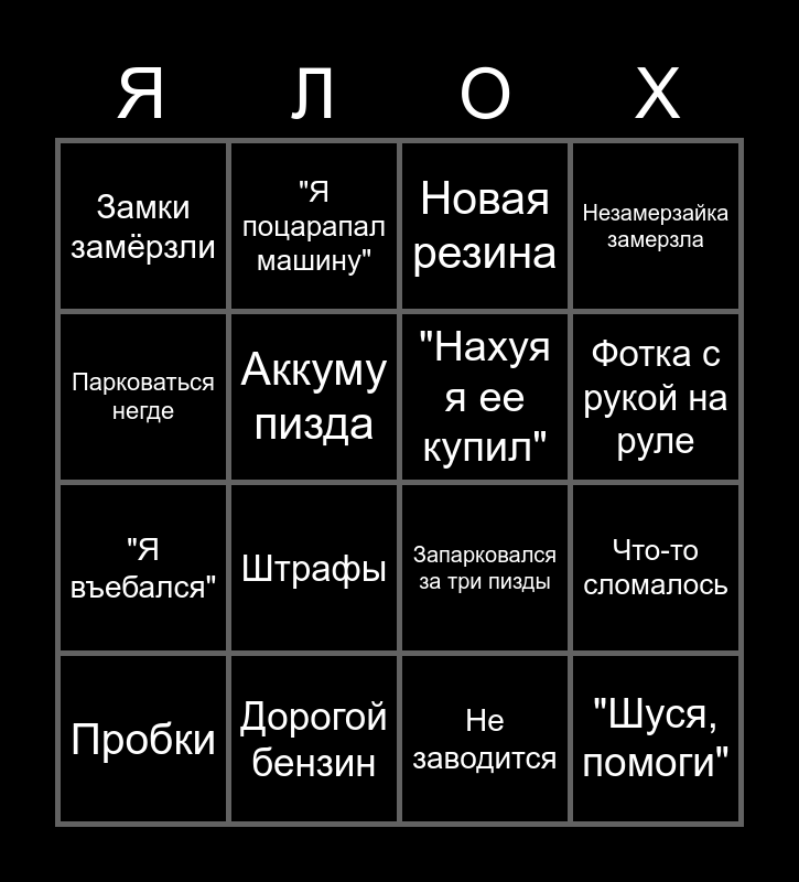 This bingo card has 16 words: Дорогой бензин, Что-то сломалось, Новая резина, Замки замёрзли, "Я въебался", "Я поцарапал машину", Запарковался за три пизды, Не заводится, Парковаться негде, Аккуму пизда, Пробки, Незамерзайка замерзла, Штрафы, Фотка с рукой на руле, "Нахуя я ее купил" and "Шуся, помоги".