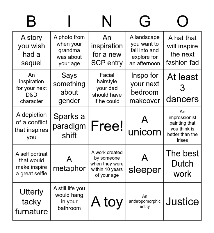 This bingo card has a free space and 44 words: A child's tears, Justice, Truly ugly shoes, Utterly tacky furnature, A dish your future mother in law wants to have at your wedding, that you distain, An anthropomorphic entity, An inspiration for a new SCP entry, Rage, A hat that will inspire the next fashion fad, A still life you would hang in your bathroom, A landscape you want to fall into and explore for an afternoon, A unicorn, A work created by someone when they were within 10 years of your age, A metaphor, A depiction of a girl created before Elizabeth's mom died., A toy, A work by a female artist created before women could vote in LA, A depiction of a conflict that inspires you, A use if your favorite color that you could use as evidence to justify your preference, At least 3 dancers, A photo from when your grandma was about your age, A hero and a villain, Monkeys, or bananas, or pickles, A story you wish had a sequel, An invertebrate, An impressionist painting that you think is better than the irises, One of Percy Jackson's relatives, Danger!, A sleeper, A self portrait that would make inspire a great selfie, A work that confuses you, or that you do not understand, The best Dutch work, Ewww, gross!, Would make a great album cover/ inspiration for your favorite musical artist, Sparks a paradigm shift, Fire!, Water! (No land visible), A work by a woman from the 17th century, Facial hairstyle your dad should have if he could, An inspiration for your next D&D character, Inspo for your next bedroom makeover, Says something about race, Says something about gender and Says something about economics.