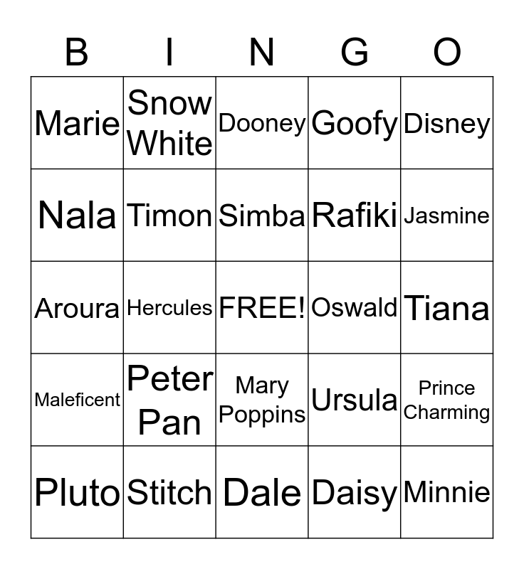 This bingo card has a free space and 45 words: Mickey, Minnie, Glove, Pluto, Donald, Daisy, Dooney, Bourke, Disney, Stitch, Goofy, Oswald, Mary Poppins, Peter Pan, Chip, Dale, Ariel, Aroura, Cinderella, Jasmine, Snow White, Elsa, Anna, Marie, Belle, Tiana, Mulan, Cruella Deville, Ursula, Maleficent, Evil Queen, Prince Charming, Aladdin, Jafar, Hades, Hercules, Kristoff, Olaf, Baymax, Simba, Nala, Rafiki, Mufasa, Timon and Pumba.