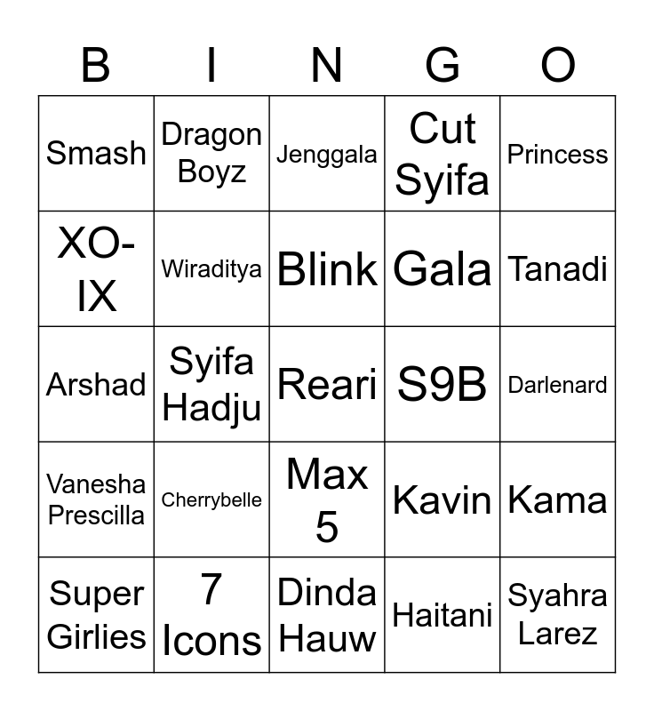 This bingo card has a free space and 24 words: Cherrybelle, 7 Icons, Blink, Super Girlies, Princess, Smash, XO-IX, Dragon Boyz, S9B, Max 5, Gala, Arshad, Kavin, Kama, Wiraditya, Haitani, Darlenard, Jenggala, Tanadi, Syifa Hadju, Syahra Larez, Vanesha Prescilla, Cut Syifa and Dinda Hauw.