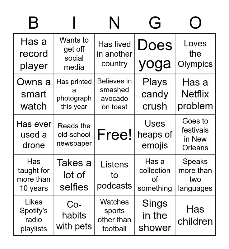 This bingo card has a free space and 24 words: Takes a lot of selfies, Co-habits with pets, Believes in smashed avocado on toast, Likes Spotify's radio playlists, Loves the Olympics, Has a record player, Owns a smart watch, Wants to get off social media, Uses heaps of emojis, Listens to podcasts, Plays candy crush, Has ever used a drone, Has a collection of something, Speaks more than two languages, Has printed a photograph this year, Sings in the shower, Goes to festivals in New Orleans, Has lived in another country, Has a Netflix problem, Reads the old-school newspaper, Has children, Has taught for more than 10 years, Does yoga and Watches sports other than football.