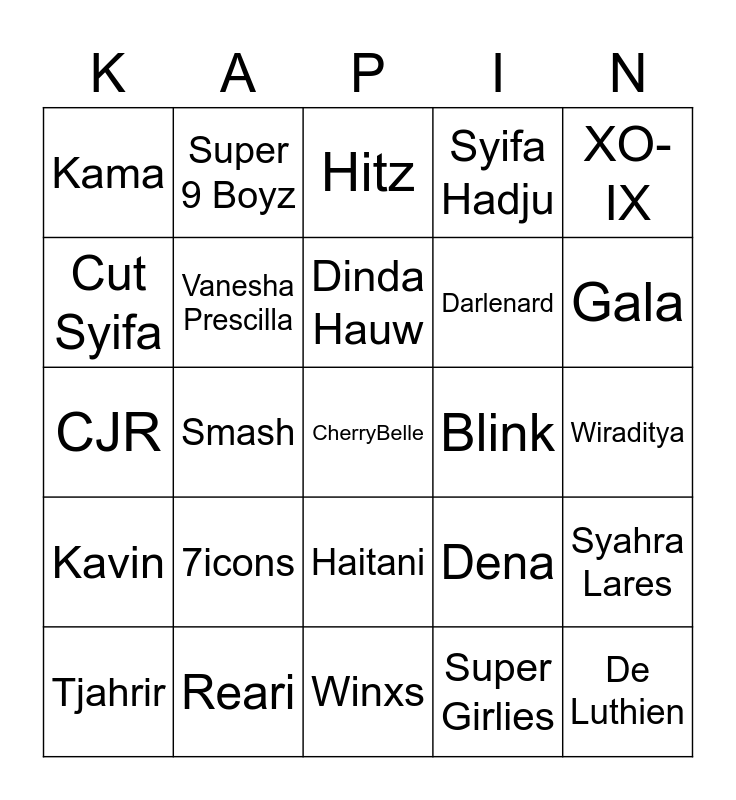 This bingo card has a free space and 24 words: 7icons, Reari, Dinda Hauw, Tjahrir, XO-IX, Kama, Cut Syifa, Super 9 Boyz, Blink, Haitani, Darlenard, CJR, Dena, Syahra Lares, Vanesha Prescilla, Super Girlies, Wiraditya, Hitz, Gala, Smash, De Luthien, Kavin, Syifa Hadju and Winxs.