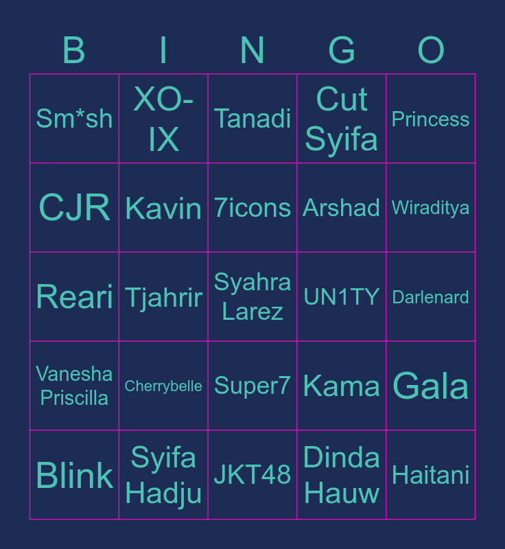 This bingo card has 25 words: Cherrybelle, JKT48, 7icons, Blink, Princess, Sm*sh, CJR, XO-IX, UN1TY, Super7, Arshad, Reari, Kama, Gala, Kavin, Haitani, Darlenard, Tanadi, Wiraditya, Tjahrir, Syahra Larez, Syifa Hadju, Vanesha Priscilla, Cut Syifa and Dinda Hauw.