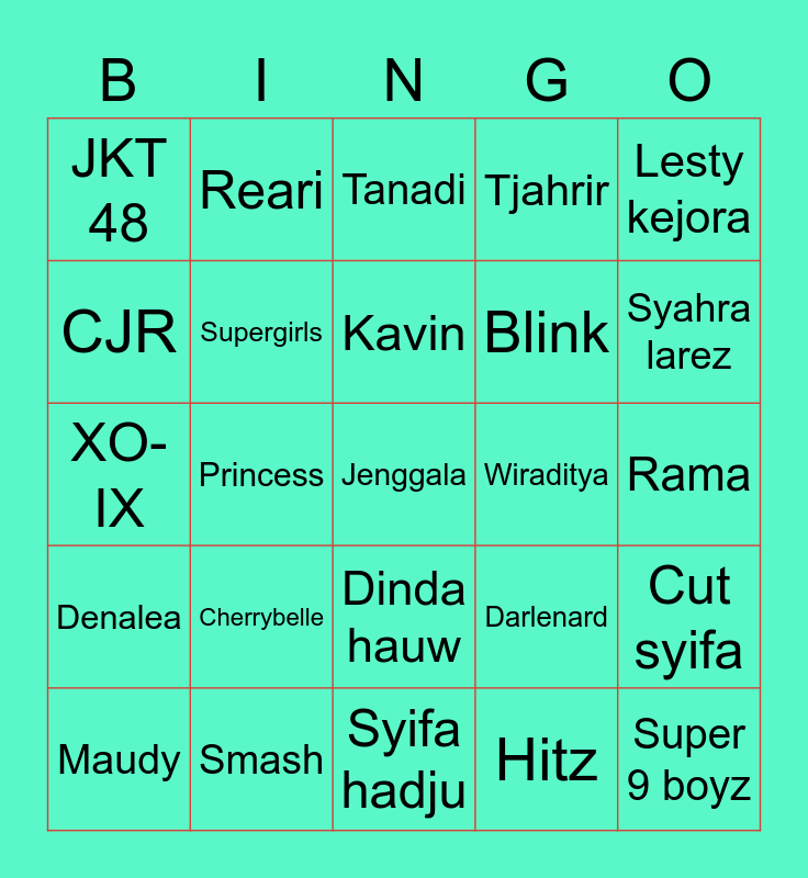 This bingo card has a free space and 24 words: Cherrybelle, Smash, Kavin, Maudy, Lesty kejora, JKT 48, CJR, Reari, Wiraditya, Dinda hauw, Blink, XO-IX, Darlenard, Cut syifa, Supergirls, Hitz, Rama, Tanadi, Syahra larez, Princess, Super 9 boyz, Denalea, Tjahrir and Syifa hadju.