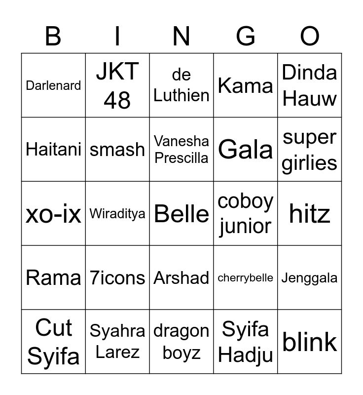This bingo card has a free space and 24 words: 7icons, Syahra Larez, Vanesha Prescilla, Cut Syifa, Dinda Hauw, Darlenard, Haitani, JKT 48, coboy junior, Arshad, Gala, xo-ix, cherrybelle, Jenggala, smash, Syifa Hadju, hitz, de Luthien, super girlies, Wiraditya, blink, Rama, Kama and dragon boyz.