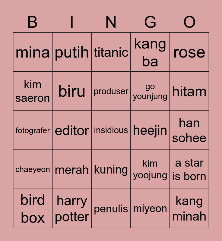 This bingo card has a free space and 24 words: merah, harry potter, produser, bird box, rose, mina, kim saeron, putih, heejin, kuning, go younjung, fotografer, kim yoojung, a star is born, biru, miyeon, han sohee, titanic, hitam, editor, kang minah, chaeyeon, kang ba and penulis.