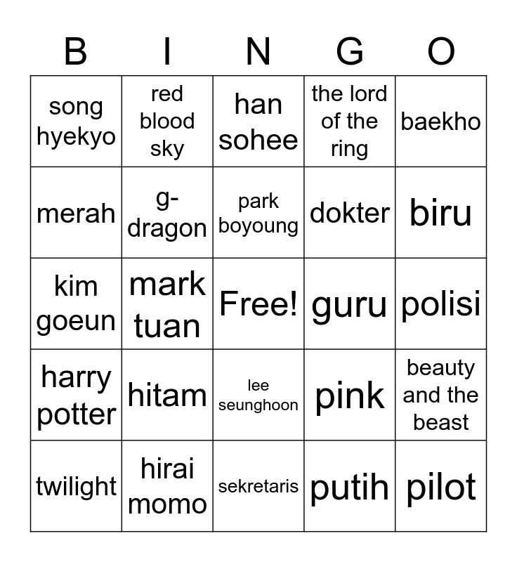 This bingo card has a free space and 25 words: hitam, sekretaris, park boyoung, twilight, baekho, song hyekyo, merah, red blood sky, guru, lee seunghoon, dokter, kim goeun, pink, beauty and the beast, g-dragon, suzy, polisi, han sohee, biru, mark tuan, pilot, hirai momo, harry potter, the lord of the ring and putih.