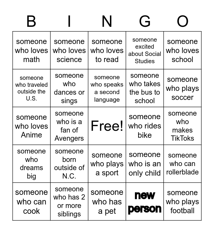 This bingo card has a free space and 24 words: someone born outside of N.C., someone who has 2 or more siblings, someone who speaks a second language, someone who can cook, someone who loves school, someone who loves math, someone who traveled outside the U.S., someone who loves science, someone who rides bike, someone who plays a sport, someone who takes the bus to school, someone who loves Anime, someone who is an only child, someone who can rollerblade, someone who dances or sings, new person, someone who makes TikToks, someone who loves to read, someone who plays soccer, someone who is a fan of Avengers, someone who plays football, someone who dreams big, someone excited about Social Studies and someone who has a pet.