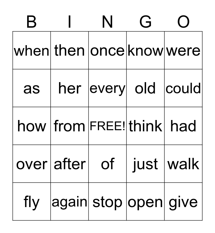 This bingo card has a free space and 24 words: after, again, every, fly, were, when, as, then, think, of, old, how, just, walk, her, open, had, once, could, from, give, over, know and stop.