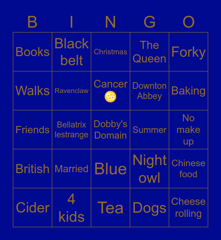 This bingo card has a free space and 24 words: Married, 4 kids, Cancer ♋️, Cider, Forky, Books, Walks, Black belt, Summer, Blue, Downton Abbey, Friends, Night owl, Chinese food, Ravenclaw, Dogs, No make up, Christmas, Baking, Bellatrix lestrange, Cheese rolling, British, The Queen and Tea.