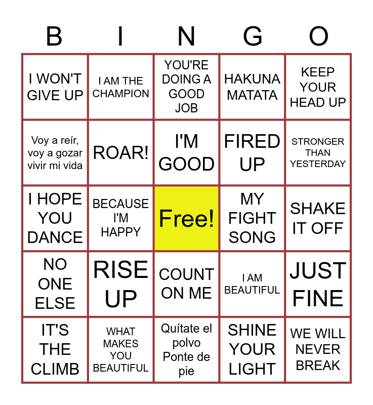 This bingo card has a free space and 24 words: RISE UP, WHAT MAKES YOU BEAUTIFUL, I'M GOOD, IT'S THE CLIMB, KEEP YOUR HEAD UP, I WON'T GIVE UP, Voy a reír, voy a gozar vivir mi vida, I AM THE CHAMPION, MY FIGHT SONG, COUNT ON ME, FIRED UP, I HOPE YOU DANCE, I AM BEAUTIFUL, JUST FINE, ROAR!, SHINE YOUR LIGHT, SHAKE IT OFF, YOU'RE DOING A GOOD JOB, STRONGER THAN YESTERDAY, BECAUSE I'M HAPPY, WE WILL NEVER BREAK, NO ONE ELSE, HAKUNA MATATA and Quítate el polvo Ponte de pie.