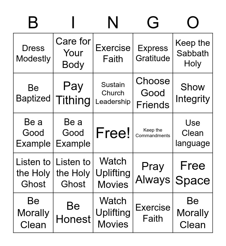 This bingo card has a free space and 49 words: Show Integrity, Be Morally Clean, Listen to Good Music, Watch Uplifting Movies, Listen to the Holy Ghost, Attend and Participate in Meetings, Care for Your Body, Gain a Testimony, Be Baptized, Be Honest, Pay Tithing, Express Gratitude, Free Space, Pray Always, Use Clean language, Honor Parents, Sustain Church Leadership, Keep the Commandments, Serve Others, Keep the Sabbath Holy, Be a Good Example, Exercise Faith, Dress Modestly, Choose Good Friends, Love One Another and Yourself, Show Integrity, Be Morally Clean, Listen to Good Music, Watch Uplifting Movies, Listen to the Holy Ghost, Attend and Participate in Meetings, Care for Your Body, Gain a Testimony, Be Baptized, Be Honest, Pay Tithing, Express Gratitude, Pray Always, Use Clean language, Honor Parents, Sustain Church Leadership, Keep the Commandments, Serve Others, Keep the Sabbath Holy, Be a Good Example, Exercise Faith, Dress Modestly, Choose Good Friends and Love One Another and Yourself.