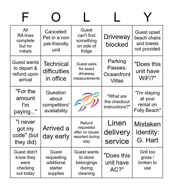 This bingo card has a free space and 29 words: Guest didn't know they were checking out today, Too old to use a computer, Question about competitors' availability, Guest refuses E.I. or L.O. due to fee, All RA lines complete but no initials, Guest can't find something on side of fridge, Technical difficulties in office, Arrived a day early, "What are the checkout instructions?", Guest requesting additional starter supplies, "I'm staying at your rental on Folly Beach", Grill too gross / broken to use, Guest wants to store belongings during cleaning, "Does this unit have AC?", "Does this unit have WiFi?", Asking for 1-night rentals, Refund requested after no issues reported during stay, "I never got my code" (but they did), Guest upset beach chairs and towels not provided, "For the amount I'm paying...", Linen delivery service, Mug redelivery for guest who was home, Parking Passes: Oceanfront Villas, Guest wants to depart & refund upon arrival, Driveway blocked, Canceled: Pet in a non pet-friendly unit, Mistaken Identity: G. Hart, Guest asks for exact driveway measurements and Walk-In Sales Person.