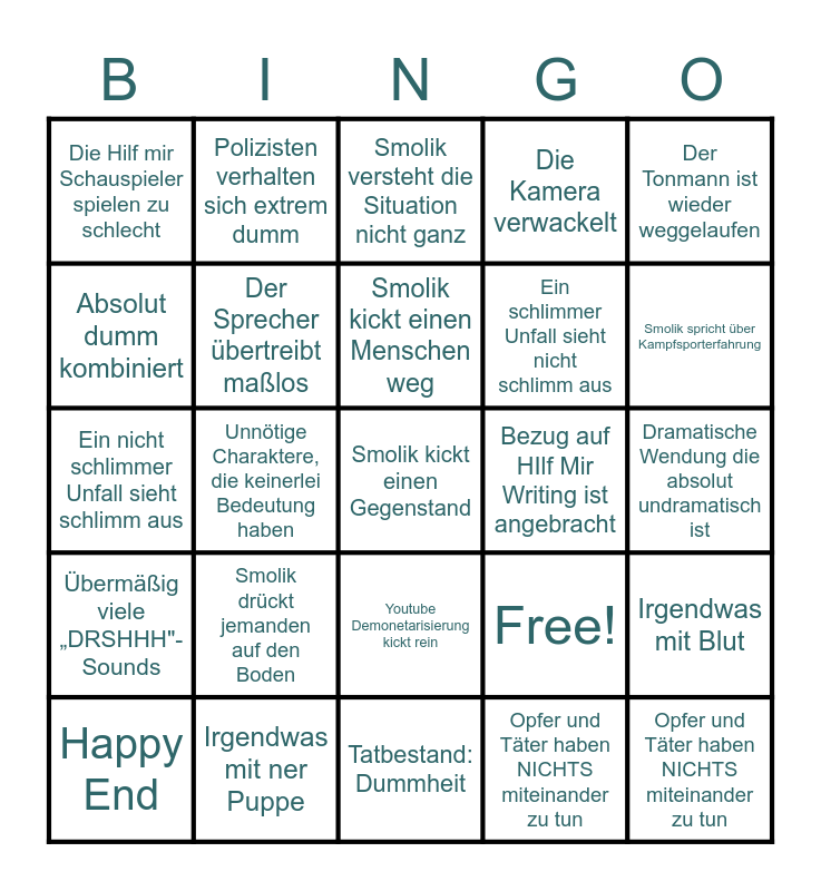 This bingo card has 25 words: Smolik drückt jemanden auf den Boden, Tatbestand: Dummheit, Smolik kickt einen Menschen weg, Happy End, Der Tonmann ist wieder weggelaufen, Die Hilf mir Schauspieler spielen zu schlecht, Absolut dumm kombiniert, Polizisten verhalten sich extrem dumm, Bezug auf HIlf Mir Writing ist angebracht, Youtube Demonetarisierung kickt rein, Ein schlimmer Unfall sieht nicht schlimm aus, Ein nicht schlimmer Unfall sieht schlimm aus, Free!, Irgendwas mit Blut, Der Sprecher übertreibt maßlos, Opfer und Täter haben NICHTS miteinander zu tun, Dramatische Wendung die absolut undramatisch ist, Smolik versteht die Situation nicht ganz, Smolik spricht über Kampfsporterfahrung, Unnötige Charaktere, die keinerlei Bedeutung haben, Smolik kickt einen Gegenstand, Irgendwas mit ner Puppe, Übermäßig viele „DRSHHH"-Sounds, Die Kamera verwackelt and Opfer und Täter haben NICHTS miteinander zu tun.