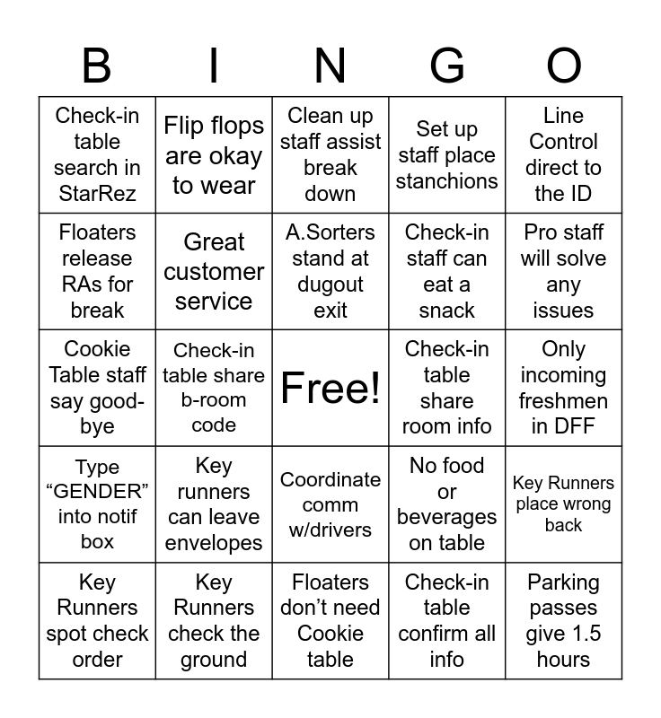 This bingo card has a free space and 35 words: Limited cell phone use, Van pick-up 15mins before shift, Be on time, Great customer service, Coordinate comm w/drivers, Set up staff place stanchions, Floaters release RAs for break, Floaters must know all positions, A.Sorters stand at dugout exit, A.Sorters ask where students liv, Cookie Table staff say good-bye, Line Control direct to the ID, Line Control direct lost student, Greeters check underage students, Check-in table search in StarRez, Check-in table share room info, Check-in table confirm all info, Check-in table share b-room code, Type “GENDER” into notif box, Parking passes give 1.5 hours, No food or beverages on table, Key Runners spot check order, Key Runners place wrong back, Key Runners check the ground, Clean up staff assist break down, Pro staff will solve any issues, You can wear any shirt, Parking passes give 3 hours, Check-in staff can eat a snack, Only incoming freshmen in DFF, Line controllers should leave, Floaters don’t need Cookie table, Key runners can leave envelopes, Flip flops are okay to wear and Key envelopes are alphabetical.