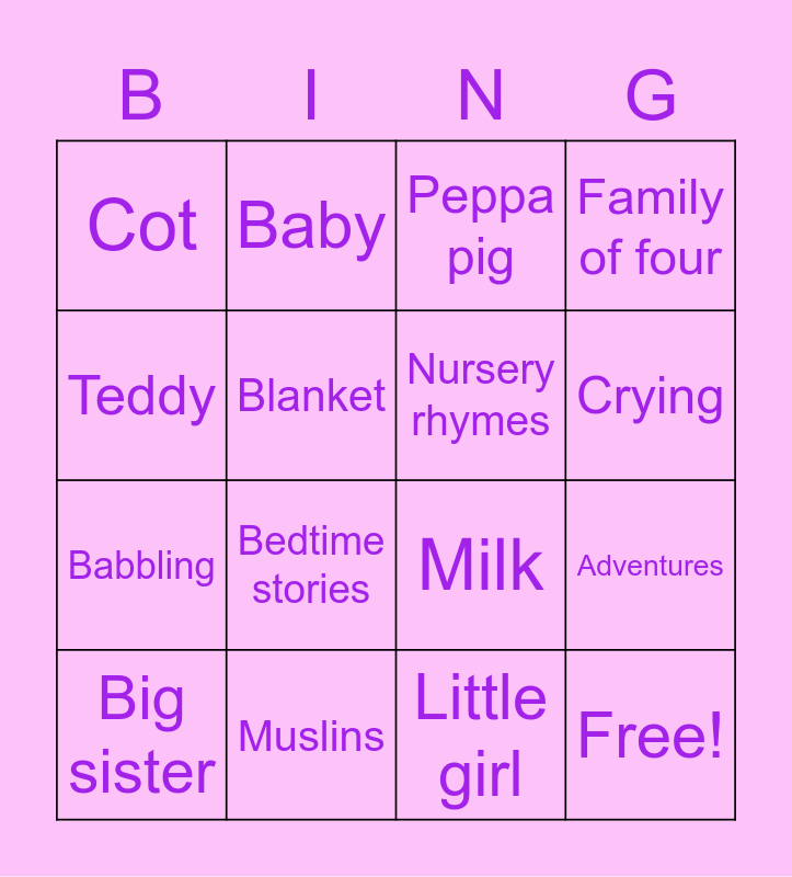This bingo card has 23 words: Free!, Nappy, Crying, Cuddles, Teddy, Cot, Blanket, Baby, Big sister, Toys, Bedtime stories, Babbling, Booties, Baby grows, Muslins, Rattle, Peppa pig, Milk, Nursery rhymes, Adventures, Family of four, Little girl and Loved.