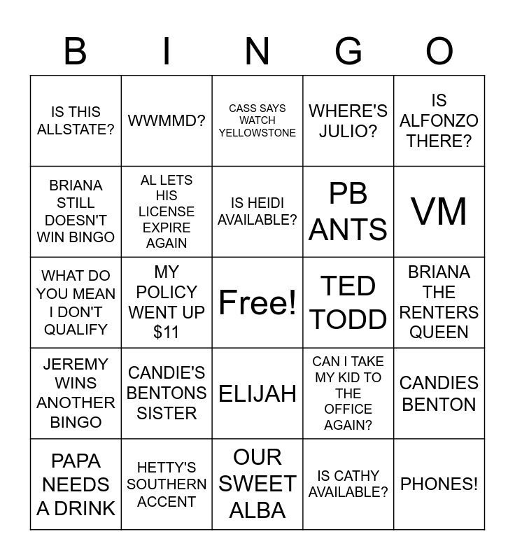 This bingo card has a free space and 24 words: CANDIE'S BENTONS SISTER, HETTY'S SOUTHERN ACCENT, IS HEIDI AVAILABLE?, PAPA NEEDS A DRINK, IS ALFONZO THERE?, IS THIS ALLSTATE?, BRIANA STILL DOESN'T WIN BINGO, WWMMD?, TED TODD, ELIJAH, PB ANTS, WHAT DO YOU MEAN I DON'T QUALIFY, CAN I TAKE MY KID TO THE OFFICE AGAIN?, CANDIES BENTON, AL LETS HIS LICENSE EXPIRE AGAIN, IS CATHY AVAILABLE?, BRIANA THE RENTERS QUEEN, CASS SAYS WATCH YELLOWSTONE, VM, MY POLICY WENT UP $11, PHONES!, JEREMY WINS ANOTHER BINGO, WHERE'S JULIO? and OUR SWEET ALBA.