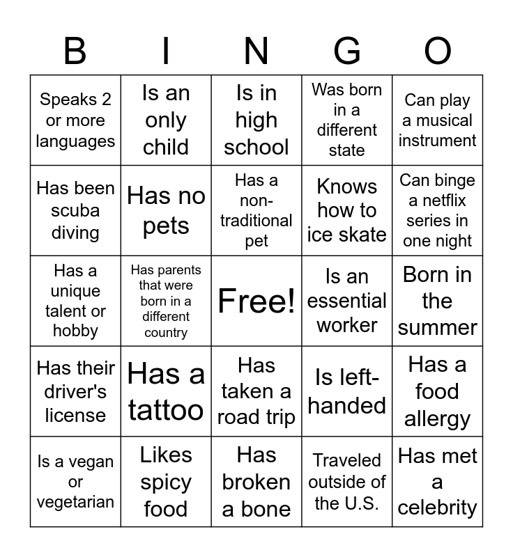 This bingo card has a free space and 24 words: Has a tattoo, Likes spicy food, Has a non-traditional pet, Is a vegan or vegetarian, Can play a musical instrument, Speaks 2 or more languages, Has been scuba diving, Is an only child, Is an essential worker, Has taken a road trip, Knows how to ice skate, Has a unique talent or hobby, Is left-handed, Has a food allergy, Has no pets, Traveled outside of the U.S., Born in the summer, Is in high school, Can binge a netflix series in one night, Has parents that were born in a different country, Has met a celebrity, Has their driver's license, Was born in a different state and Has broken a bone.