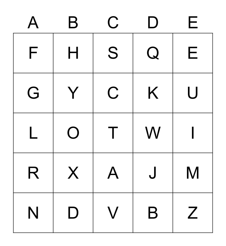 This bingo card has 26 words: A, B, C, D, E, F, G, H, I, J, K, L, M, N, O, P, Q, R, S, T, U, V, W, X, Y and Z.