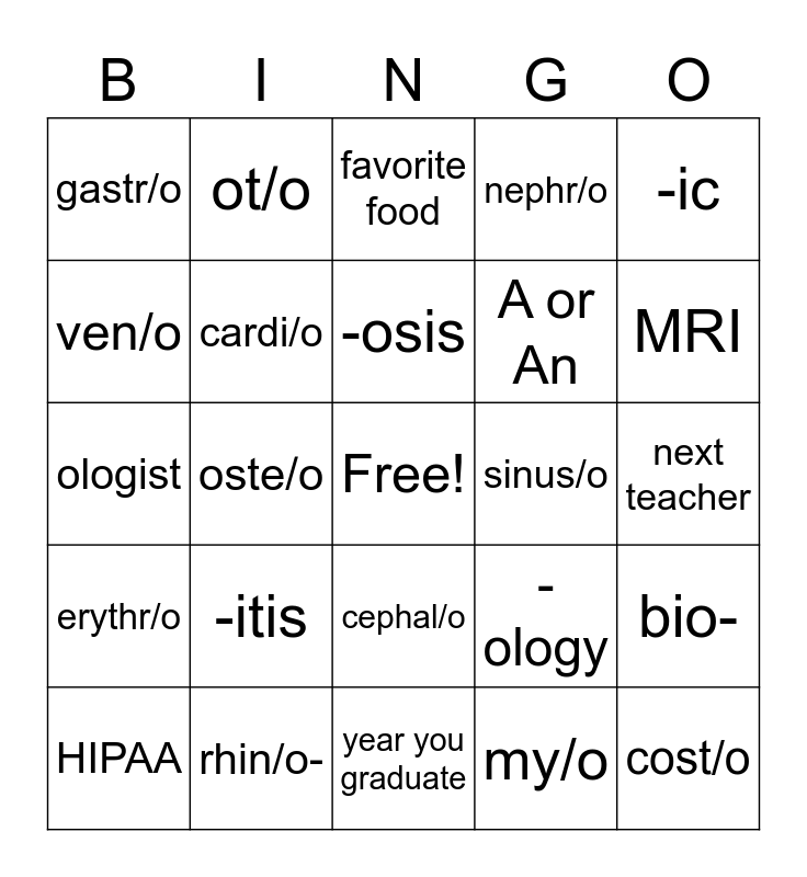 This bingo card has a free space and 24 words: -itis, rhin/o-, -osis, HIPAA, -ic, gastr/o, ven/o, ot/o, sinus/o, cephal/o, A or An, ologist, -ology, bio-, cardi/o, my/o, next teacher, favorite food, MRI, oste/o, cost/o, erythr/o, nephr/o and year you graduate.
