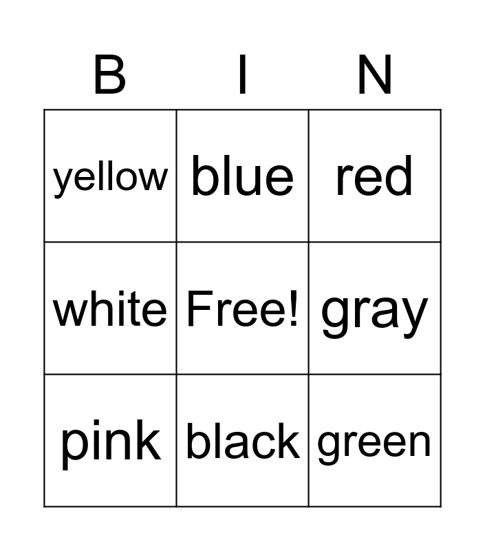 This bingo card has a free space and 8 words: gray, red, blue, pink, yellow, green, white and black.