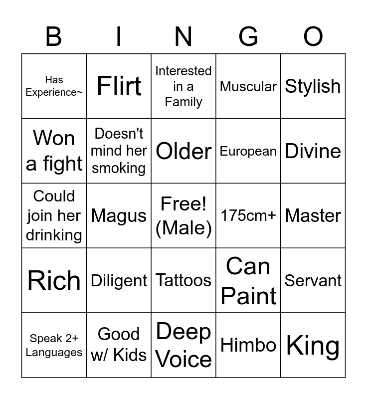 This bingo card has a free space and 24 words: Diligent, Good w/ Kids, Older, Speak 2+ Languages, Stylish, Has Experience~, Won a fight, Flirt, 175cm+, Tattoos, European, Could join her drinking, Can Paint, Servant, Doesn't mind her smoking, Himbo, Master, Interested in a Family, Divine, Magus, King, Rich, Muscular and Deep Voice.